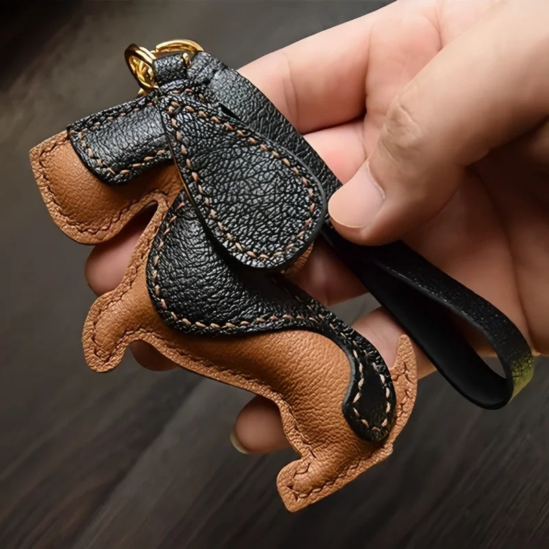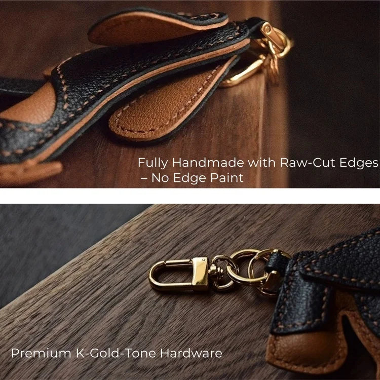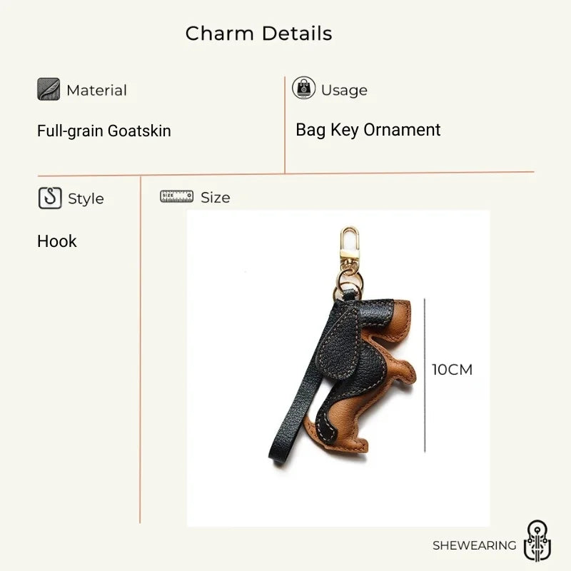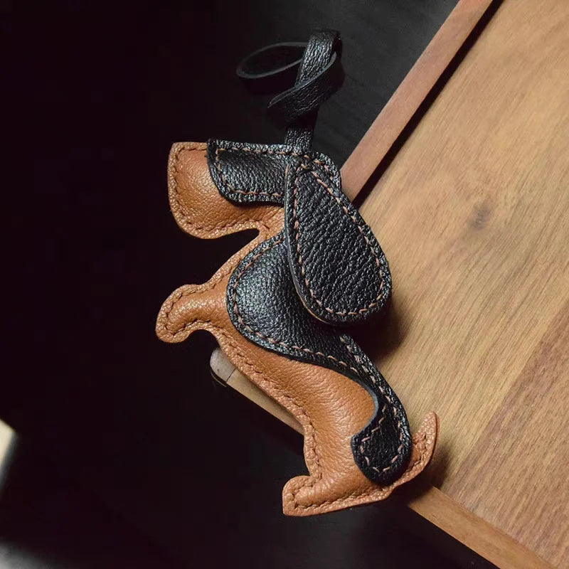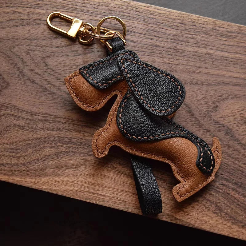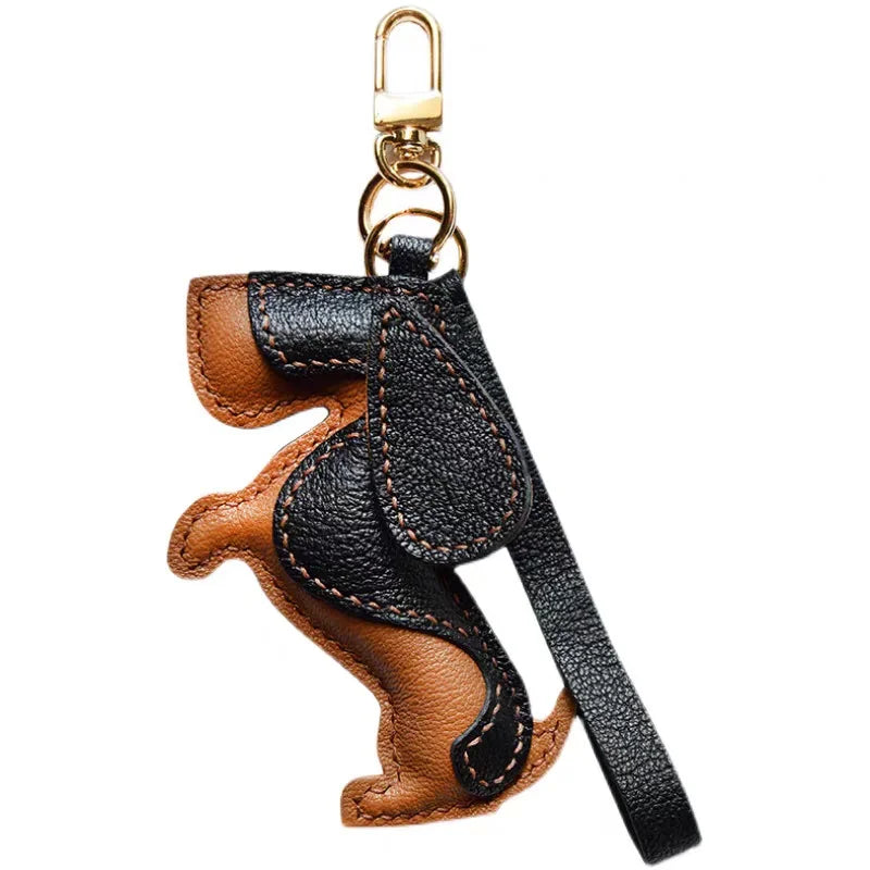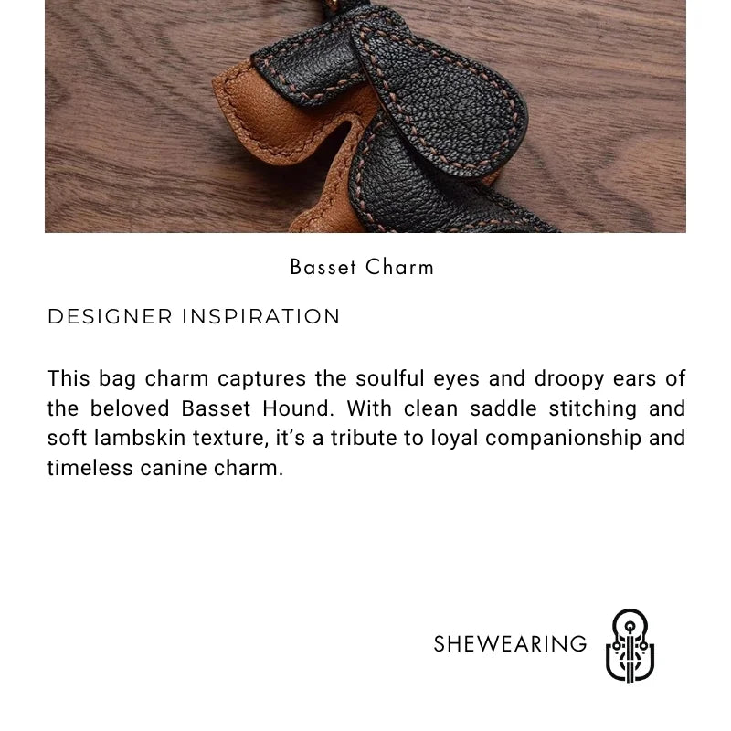 Hecho a mano con piel de cordero plena flor, este dije para bolso de Basset Hound da vida al espíritu apacible de esta icónica raza de orejas largas. Sus expresivos ojos, sus características orejas caídas y su hocico curvado hacia abajo están cuidadosamente moldeados y cosidos a mano para reflejar personalidad y elegancia. Con una refinada paleta de tonos tostados, marrones y marfil, este diseño evoca calidez y lealtad, lo que lo convierte en un regalo ideal para los amantes de las mascotas o como un accesorio único para su bolso. Compacta pero llamativa, esta pieza aporta carácter y artesanía a su estilo diario.