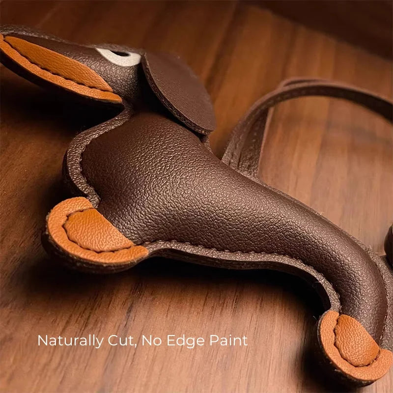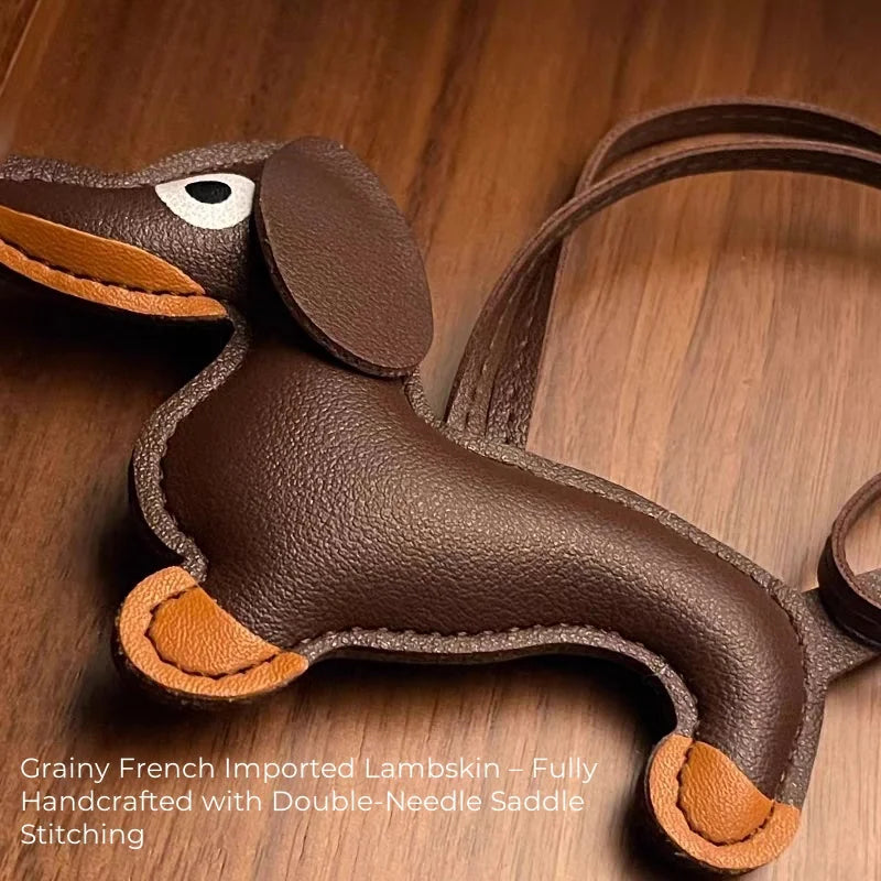 Este encantador colgante de cuero con forma de perro salchicha es un elegante homenaje a nuestro compañero favorito con forma de salchicha. Elaborado íntegramente a mano con piel de cordero granulada importada de Francia, presenta una textura suave, un corte natural sin pintura en los bordes y una precisa costura doble que le aporta estructura y estilo. El rico tono marrón chocolate se acentúa con detalles en forma de pata en un cálido tono canela y una mirada vivaz, lo que le da personalidad y calidez.