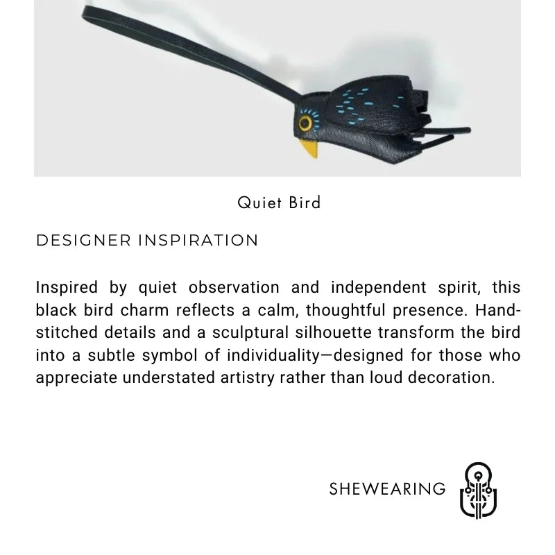 Este dije de bolso de piel de pájaro negro, hecho a mano, es un accesorio refinado creado para mujeres que valoran la individualidad, el arte y la expresión sutil. Más que un simple adorno, el pájaro se interpreta aquí como un compañero tranquilo que simboliza independencia, consciencia y una confianza serena.