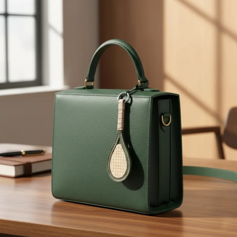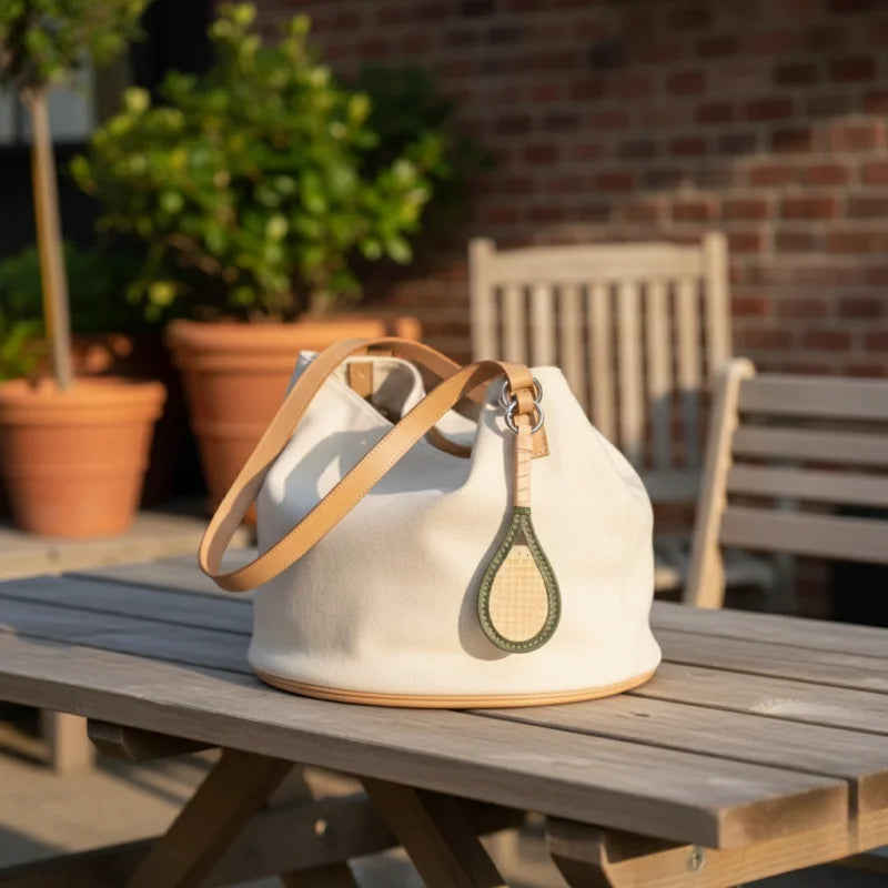 El diseño minimalista reinventa una raqueta de tenis clásica con tonos beige y oliva naturales, añadiendo un toque chic y deportivo a bolsos, bolsos tote o llaves. Cada charm está hecho a mano para lograr proporciones perfectas y una suave sensación al tacto, lo que lo convierte en un accesorio elegante para uso diario o para regalar.