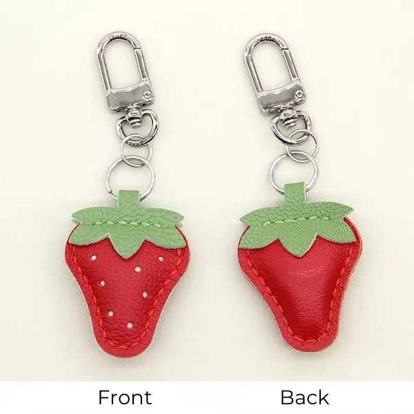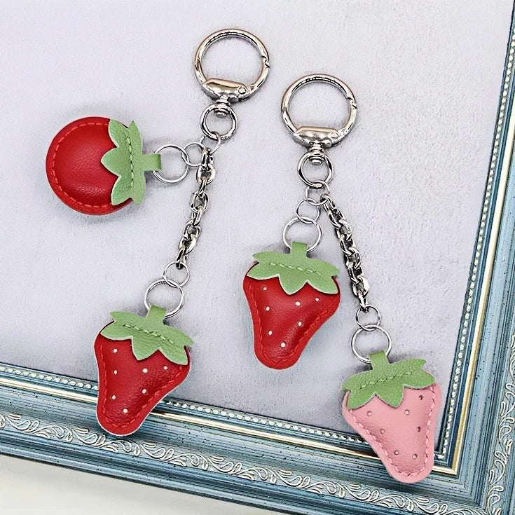 Dije de piel de fresa para bolso – Colgante artesanal de piel de cordero roja y rosa | Precioso llavero de inspiración frutal | Accesorio de piel plena flor suave para bolsos y regalos
