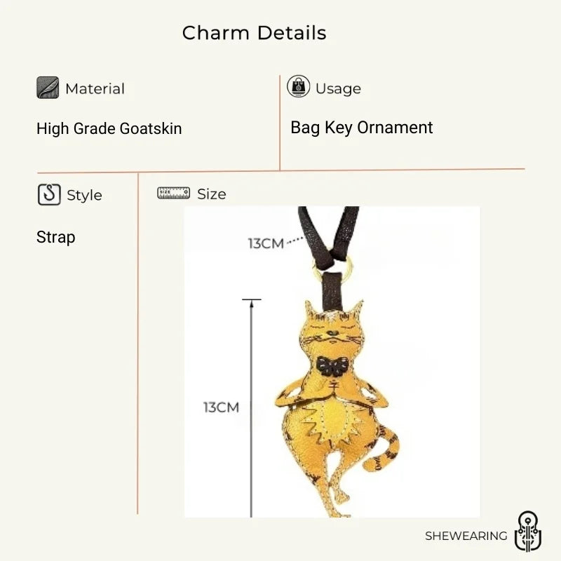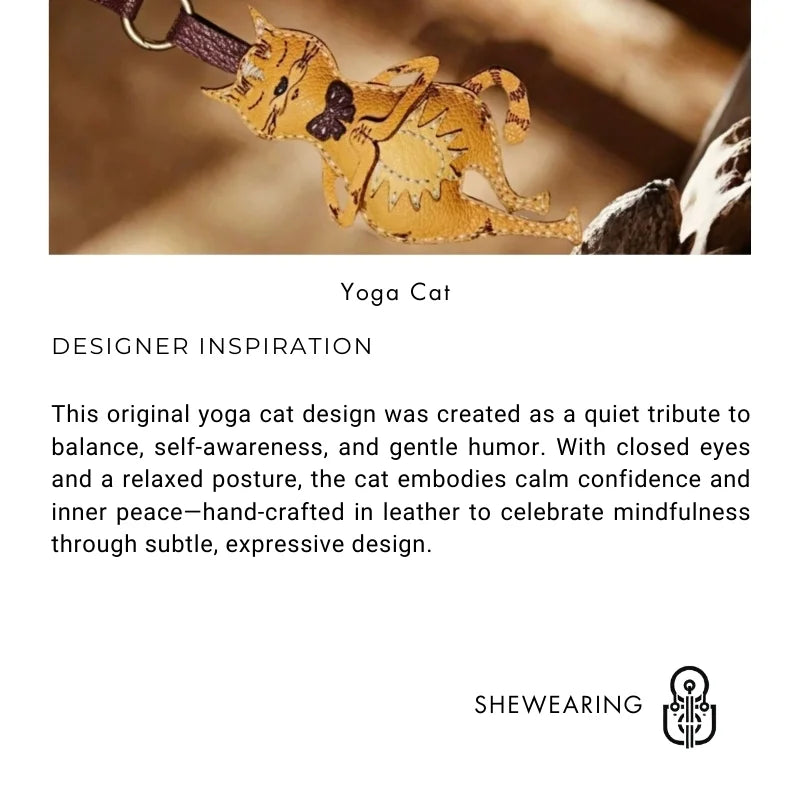 Este dije de gato yoga para bolso es un diseño original hecho a mano con cuero genuino de alta calidad, cuidadosamente moldeado y cosido a mano. Con un gato sereno en postura meditativa y un refinado detalle de pajarita, la pieza combina un humor tranquilo con una artesanía elegante, sin ser estridente ni infantil.