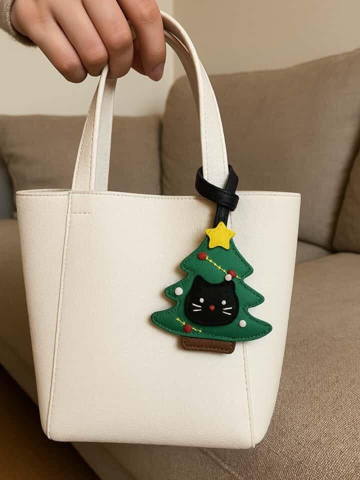 Christmas Black Cat Leather Bag Charm – Handmade Festive Tree Pendant | Cute Holiday Keychain | Whimsical Gift for Women