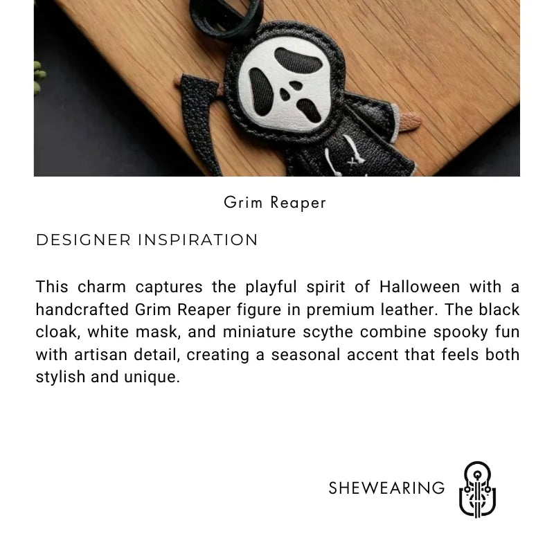 Halloween Grim Reaper Leather Bag Charm – Handmade Full-Grain Leather Keychain | Spooky Ghost Pendant | Unique Holiday Accessory for Women