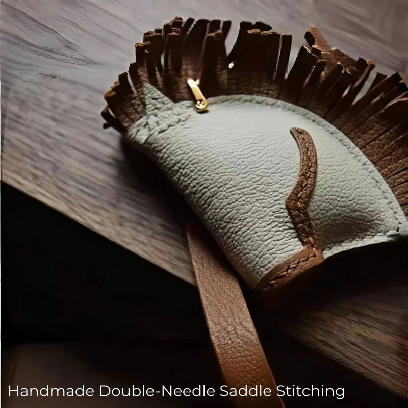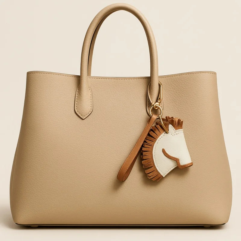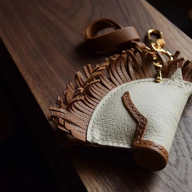 This horse-head leather bag charm is a tribute to the refined art of saddle craftsmanship, blending rustic spirit with luxury appeal. Handcrafted from premium full-grain leather, the design features intricate double-needle saddle stitching and carefully cut fringes to replicate the natural texture of a horse’s mane. The layered construction brings depth and sophistication, while the smooth ivory-toned face contrasts elegantly with the warm brown details. Equipped with high-quality gold-tone hardware and a sturdy leather strap, it is designed to attach easily to handbags, totes, or even keyrings, adding a distinctive accent to everyday essentials.