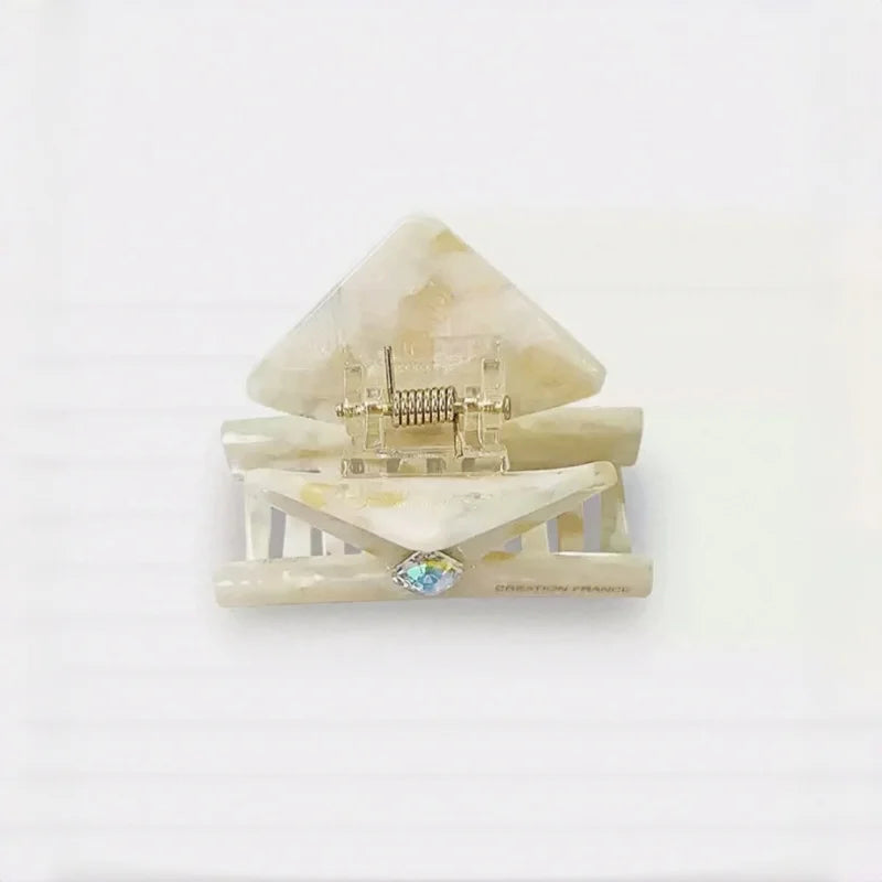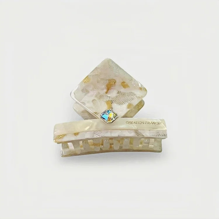 Ivory Marble Acetate Hair Claw Clip – Elegant Geometric French-Inspired Hair Accessory | Handmade Textured Square Design with Crystal Accent | Chic Minimal Hair Clip Gift for Her