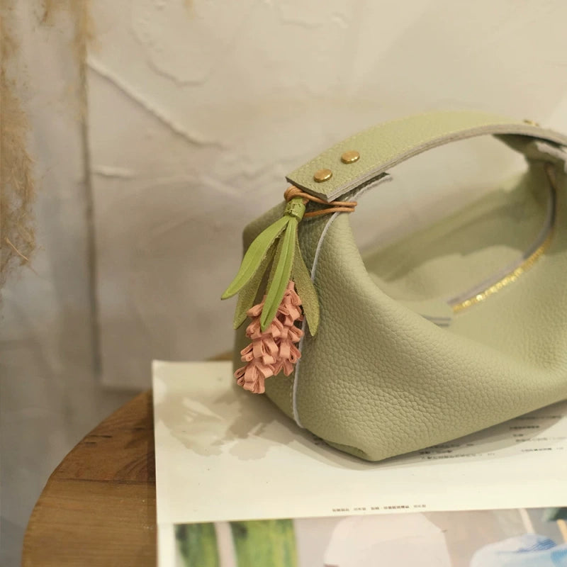 The leafy tops, dyed in natural olive or pistachio tones, balance the soft pink, purple, or white flower clusters—offering a rustic palette that complements both casual and refined accessories. Measuring 10.5cm in length, the piece is lightweight yet dimensional, ideal for use as a keychain, journal charm, or handbag pendant.