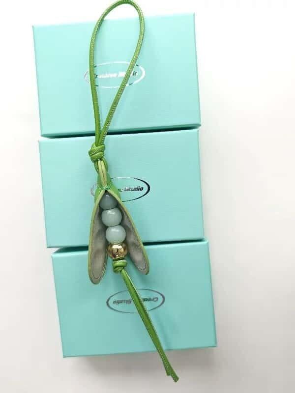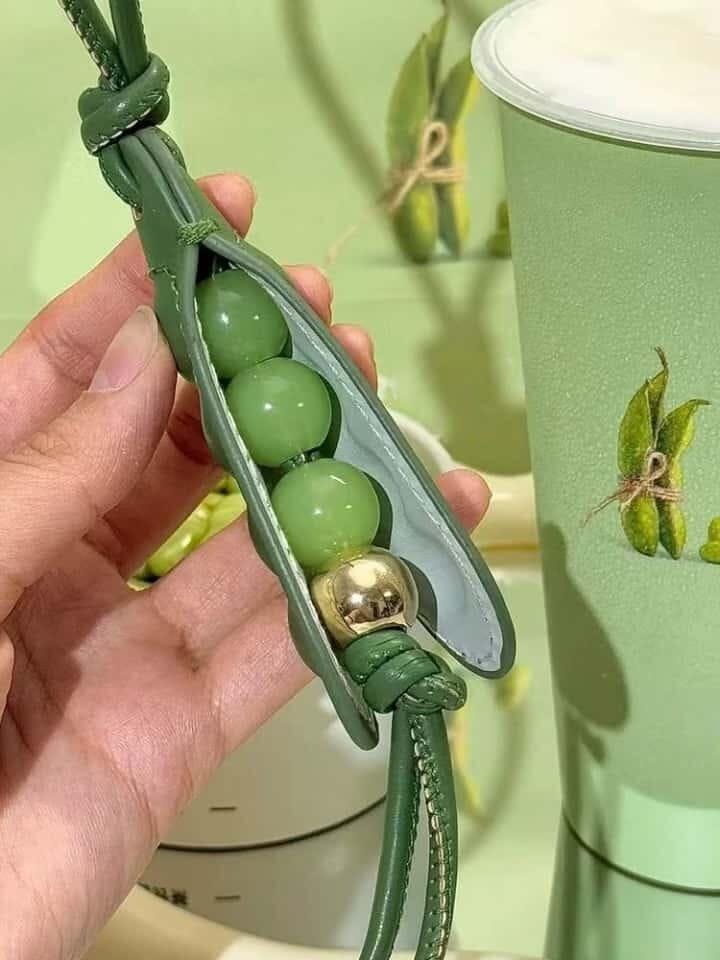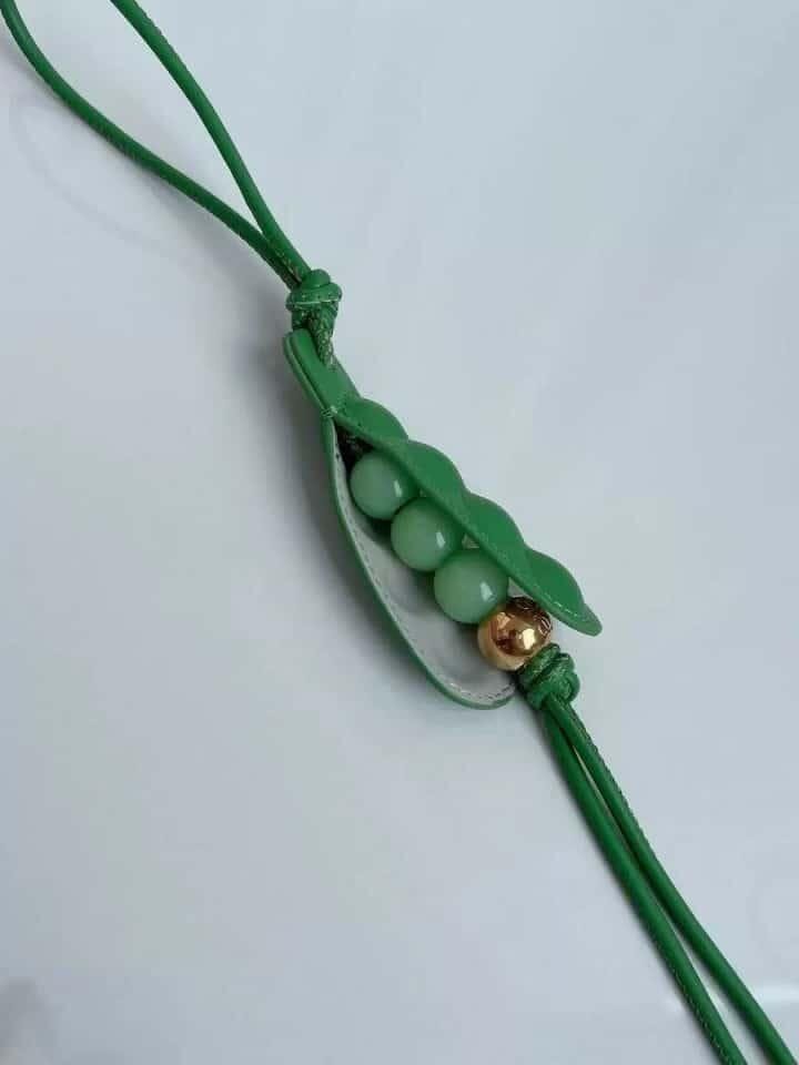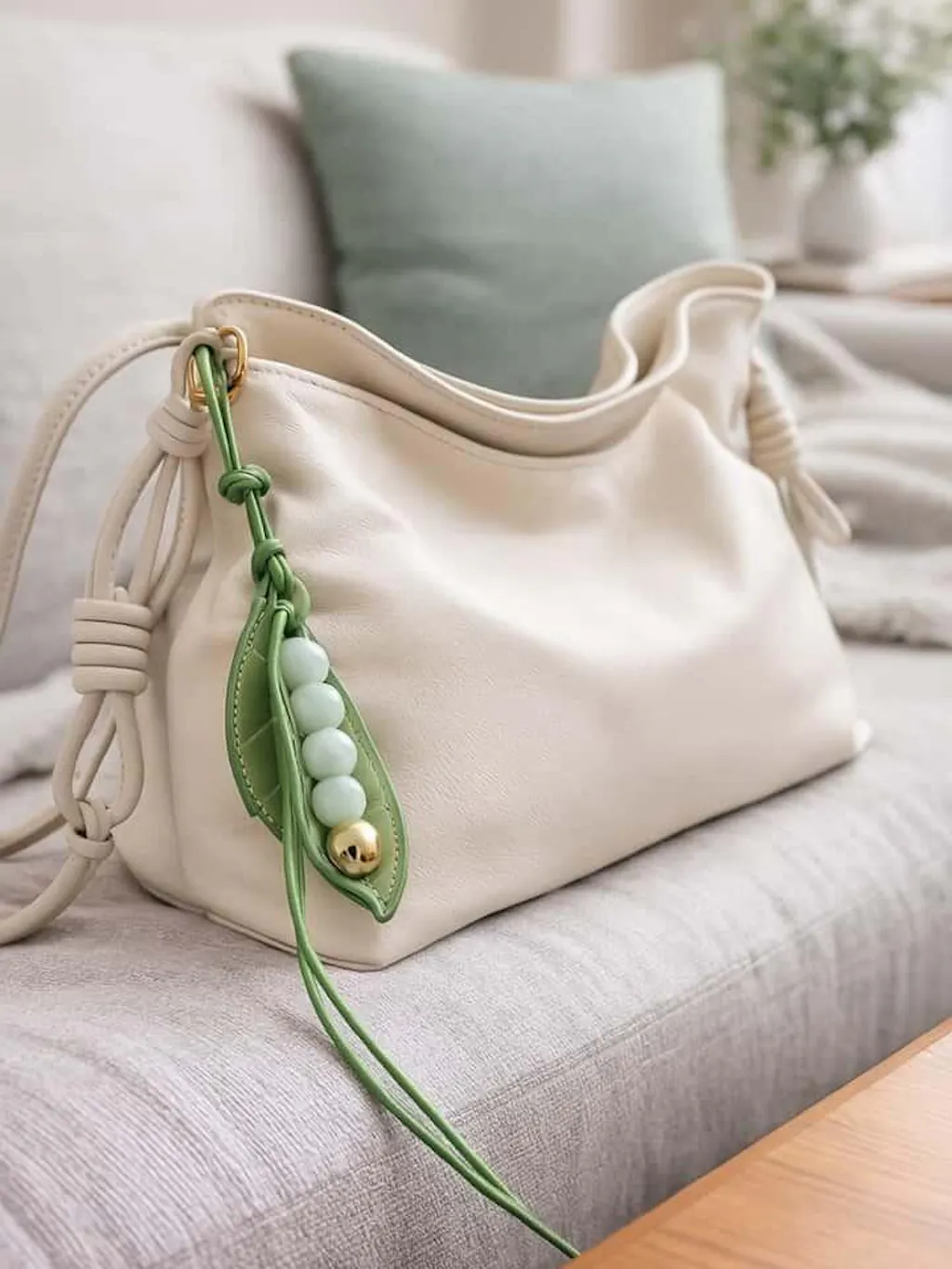 This pea pod charm looks perfect on my cream-colored bags. The soft green beads add a refreshing touch, and the little gold bead gives it just enough shine. It's subtle but still unique - exactly the kind of detail I love.