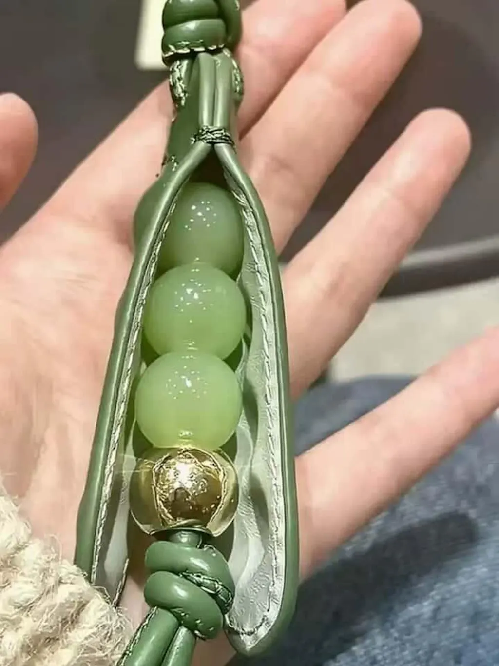 The jade-like beads are so smooth and pretty, and the pea pod design is even cuter in person. It hangs nicely on my bag and adds a playful touch without looking cheap. Several people have already asked where I got it!